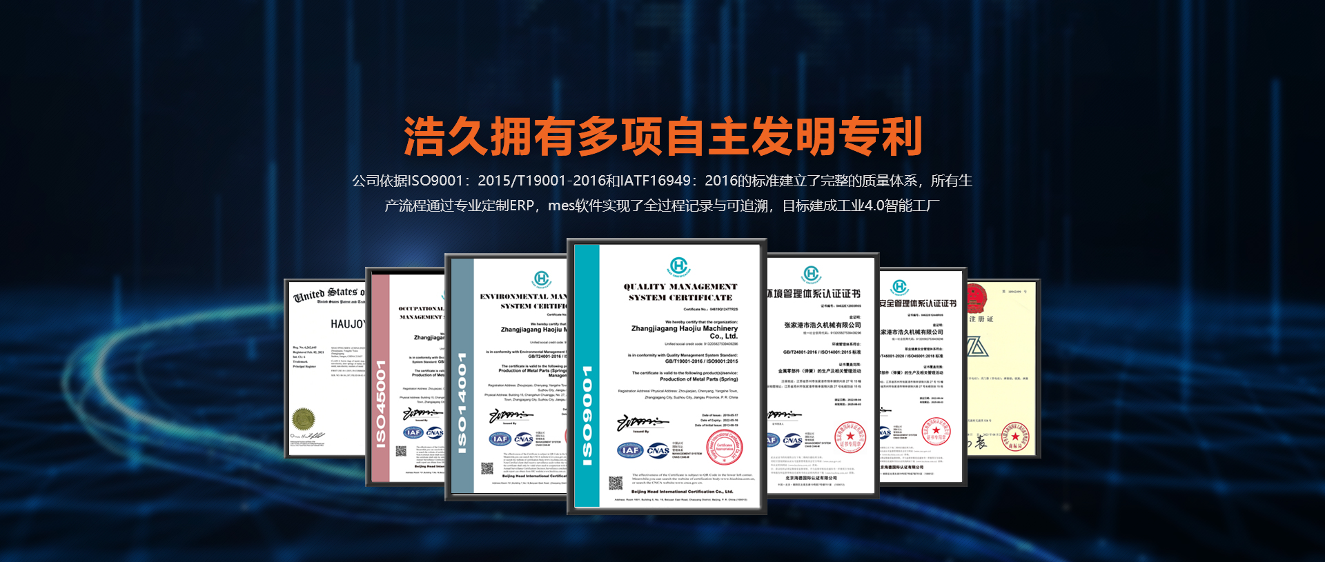 浩久擁有多項(xiàng)自主發(fā)明專利。公司依據(jù)ISO9001GB/T19001-2016和IATF:2016的標(biāo)準(zhǔn)建立了完整的質(zhì)量體系,所有生產(chǎn)流程通過專業(yè)定制ERP,mes軟件實(shí)現(xiàn)了全過程記錄與可追溯,目標(biāo)建成工業(yè)4.0智能工廠。